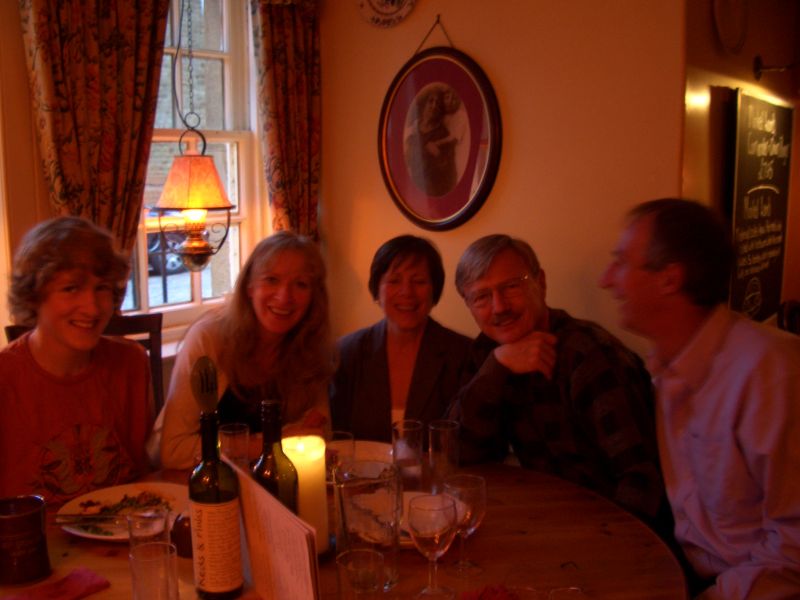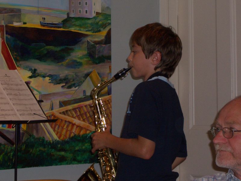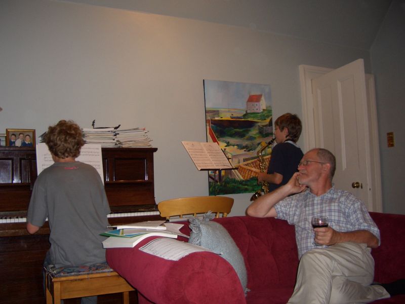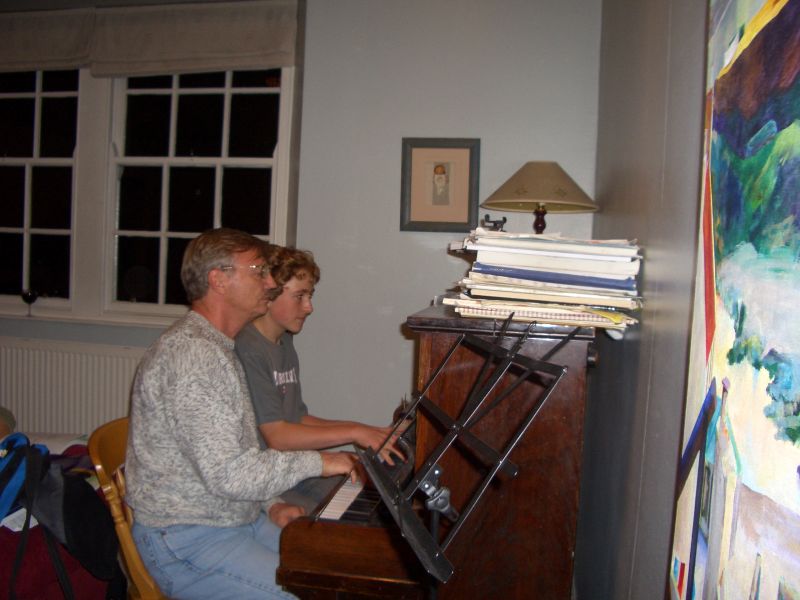We also visited her brother Morris who had a very accomplished musical family - Morris is an artist and school teacher. In the pictures are Lewis playing a duet with Fergus, Lewis and Peter playing a rather entertaining and fast-paced piano duet, and young Fergus playing the saxaphone very well after only six months' work on it. There was also Sarah who plays a beautiful violin but was upstairs when picture-taking time came around. Mom Janis joined us a little later.
