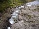 A broad stream flows out of the hills, goes under a bridge and becomes a raging torrent.