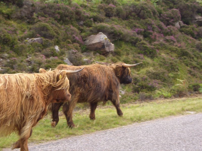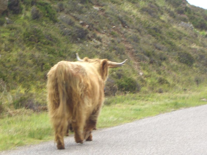 Going across the top and down the left side of the peninsular was beautiful: seascapes on the right and heather-covered hills on the left. The views across to Skye with its tall mountains was fabulous. We met various local inhabitants on the road.