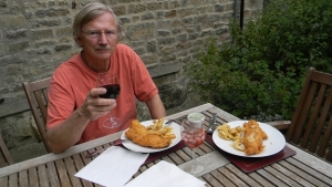 |     The weather was great so we ate our first meal on the patio. Fish and Chips, of course. |