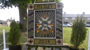 |     We next took a trip to look at well dressings. This custom probably started as a pagan "thanks for the water". Christians took over the custom and for the last several hundred years have decorated with Christian themes. Now many secular themes are creeping in. This year is the hundredth anniversary of the First World War, which was traumatic for England. This well celebrates the regiment the local folk fought in. Most villages have a well and decorate it, each one on a different date. |