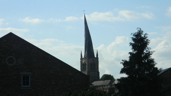 |     Our nearest town is Chesterfield. The cathedral spire was built of wood that was too green. It warped but it didn't fall so now the town is very proud of it. |