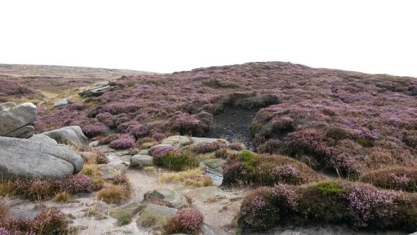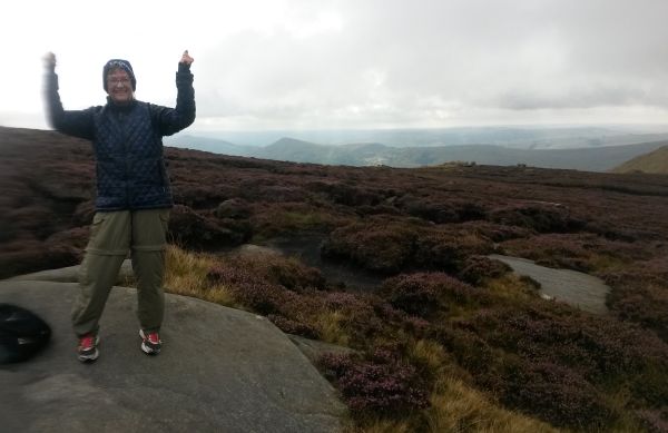 |     A significant hike was up Kinderscout. This is a plateau about 4miles by 3 miles over 2000 feet high. It is partly barren and partly heather on many feet of peat with groughs which are water-worn gullies in the peat that are up to 12 feet deep, steep sided and very twisted. Ideal for getting lost particularly when the plateau is shrouded in fog. We chose to go up Grindsbrook which is an ill-kept path that ends scrambling up a waterfall. |