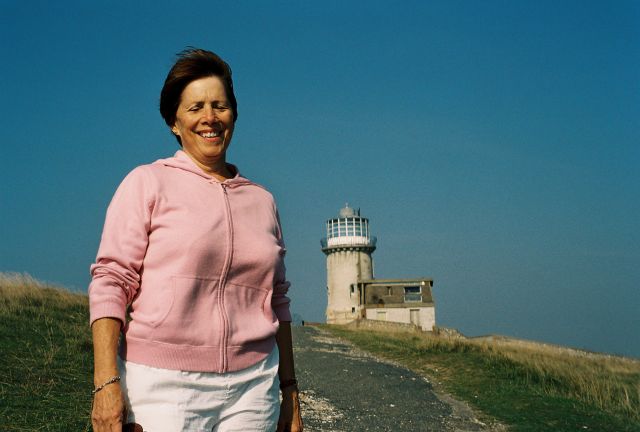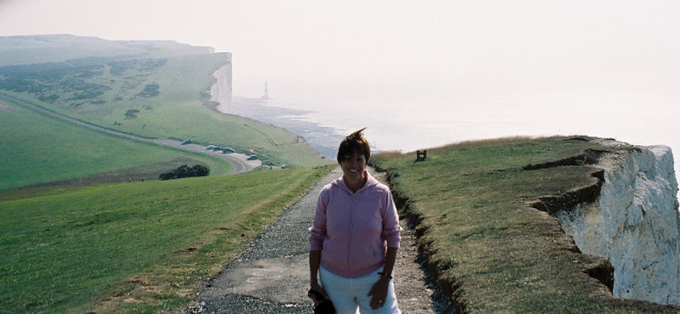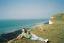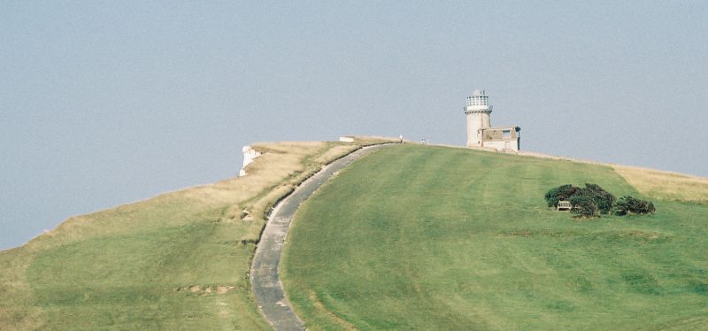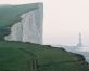 This part of the coast is where the "Downs" meet the sea. The "downs" are really "ups" - chalk hills up to 1000 feet high, covered with beautifully green grass and sheep. The sea eats away at the hills and creates cliffs up to four hundred feet high. This stretch has seven hills with valleys between them so there are seven high cliffs called the seven sisters. Beachy Head is one of the seven.