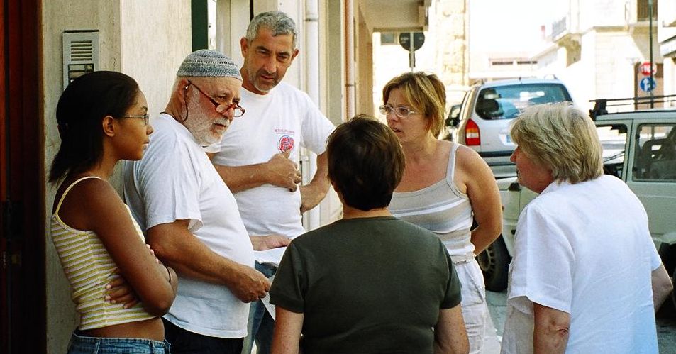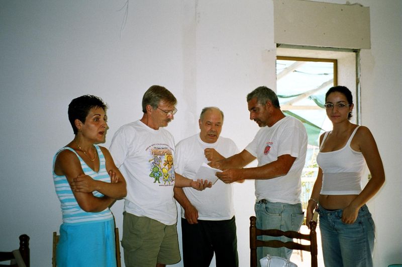 On our way in we had passed a sign to the local Scuola and had the bright idea that there might be an English teacher there who could help us as an interpreter. We mistakenly went into the "Bibloteka" which seemed to be part of the building complex and got redirected to the main part of the school where the administrators were getting ready for the start of the school year. Again, the whole staff was most helpful although none of them spoke English. They had a computer and immediately started up a "Professional Translator" program. Type in English and the Italian appears in another window. A second instance of the program for Italian to English and we had a two-way conversation going very easily. They knew of a woman, Georgiana Coker, who spoke English, they said. They also knew a Giaramida. So one of the ladies drove her car to lead the way to the home of the English speaker and the others promised to try and round up the Giaramida. I can just imagine the conversation: "Hi Pino, this is the local school" "Huh???" "We have a strange American here who wants to meet someone, anyone, called Giaramida from Santa Ninfa" "Hmmmm" "We promised you would break off work and go meet her" "You what?" "....."