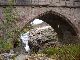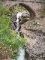 A broad stream flows out of the hills, goes under a bridge and becomes a raging torrent.