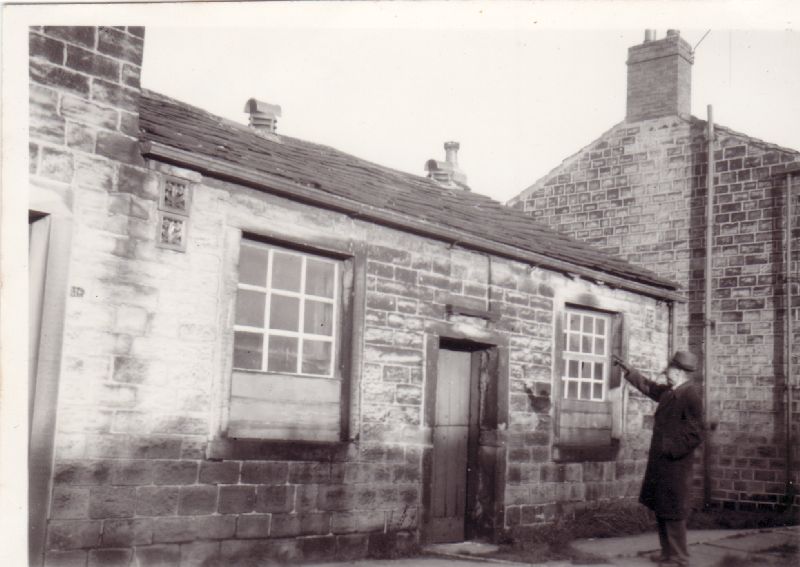 ![]() |     IMG10040.jpg - 1958 Jan GT in front of the Old Schoolhouse on Bawn in Old Farnley. GT and Mary photographed most of Old Farnley just before the Leeds Corporation pulled it down to build new housing.C247 |