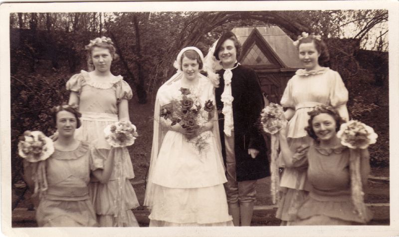 ![]() |     IMG10001.jpg - 1942 Joyce Toothill and Jeff Newsome. Joyce is GT's niece. Arnold Toothill is the tallest at the back. Keith (left) and Peter are Page Boys. Mary's favorite story is that Keith was told to walk behind Joyce in the aisle and replied -I want to walk befront- |