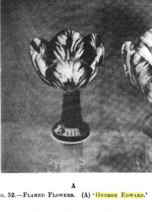First is the journal for the Royal Horticultural Society 1902-3. In it is a picture of George Edward (Schofield) the tulip named after Edward Hudson Schofield. The coloring is white with purple flames.