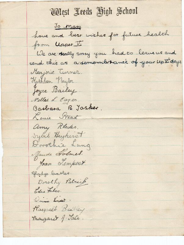 ![]() |     IMG20134.jpg - 1934 Mary, like her brothers, went to West Leeds High School starting at age 11. Upper Fifth Form is the class when one is 16 years old |