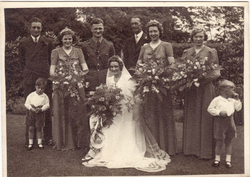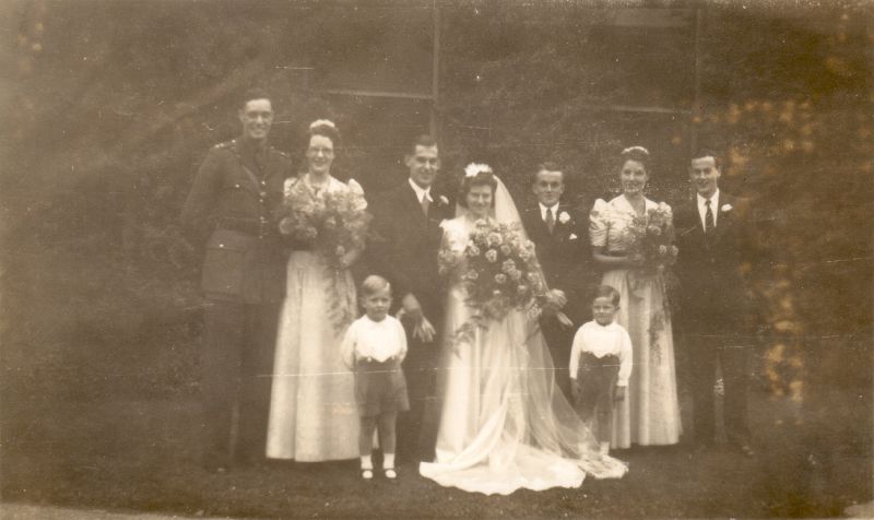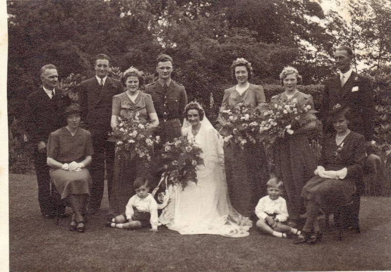 ![]() |     IMG10029.jpg - 1942 Wedding of Jean Widlake and John Schofield (son of Harry). Peter and Keith were pageboys, Peggy (John's sister) is next to right |