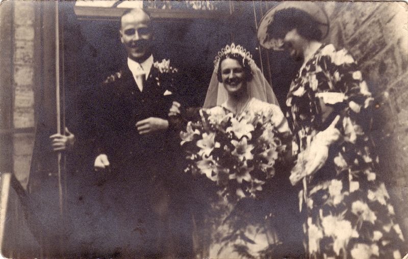 ![]() |     IMG10001.jpg - 1942 Joyce Toothill and Jeff Newsome. Joyce is GT's niece. Arnold Toothill is the tallest at the back. Keith (left) and Peter are Page Boys. Mary's favorite story is that Keith was told to walk behind Joyce in the aisle and replied -I want to walk befront- |