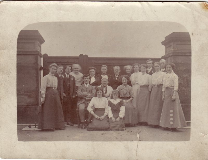 ![]() |     IMG30162.jpg - 1911 Group in front of the gates to Farnley Hall. Jim and Nora's Cottage is behind the wall to the right.Far left is Grandma Annie Shuttleworth, far right at the back is her husband, Middle seated is Aunt Polly with Jim Scott and Nora beside her |
