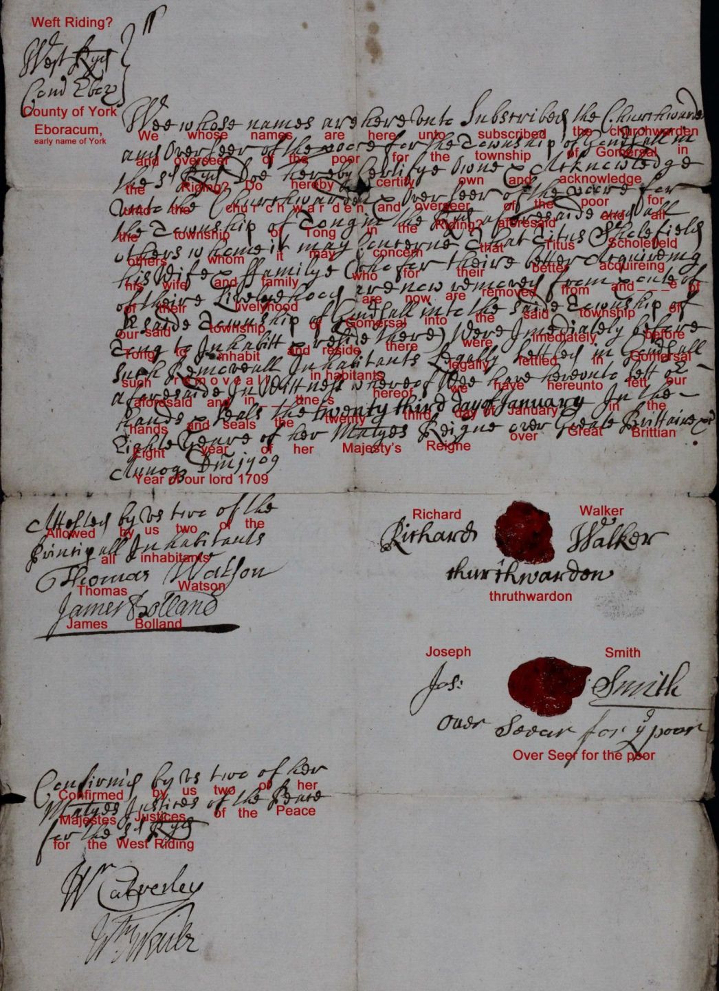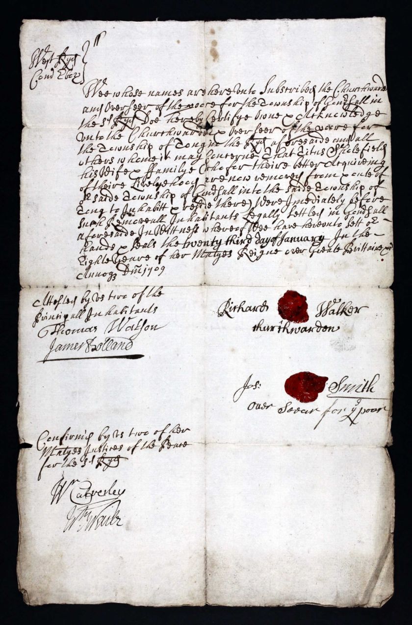 So, it turns out that in 1600 each English village and its surroundings belonged to a “Parish” centered on the local Church of England. Each Parish was controlled by the local ChurchWarden and a Board that included an “Overseer of the Poor” who controlled the amount of charity that the church paid out in the Parish. Titus, his wife and family had been on “welfare” in Gomersal and wanted to move to a nearby village, Tong, but to do so, the “Overseer of the Poor” in Tong had to be contacted by the Overseer in Gomersall and an agreement made. The document then had to be signed off by the two Churchwardens and two Justices of the Peace. Talk about red tape!!! This document is the official release.